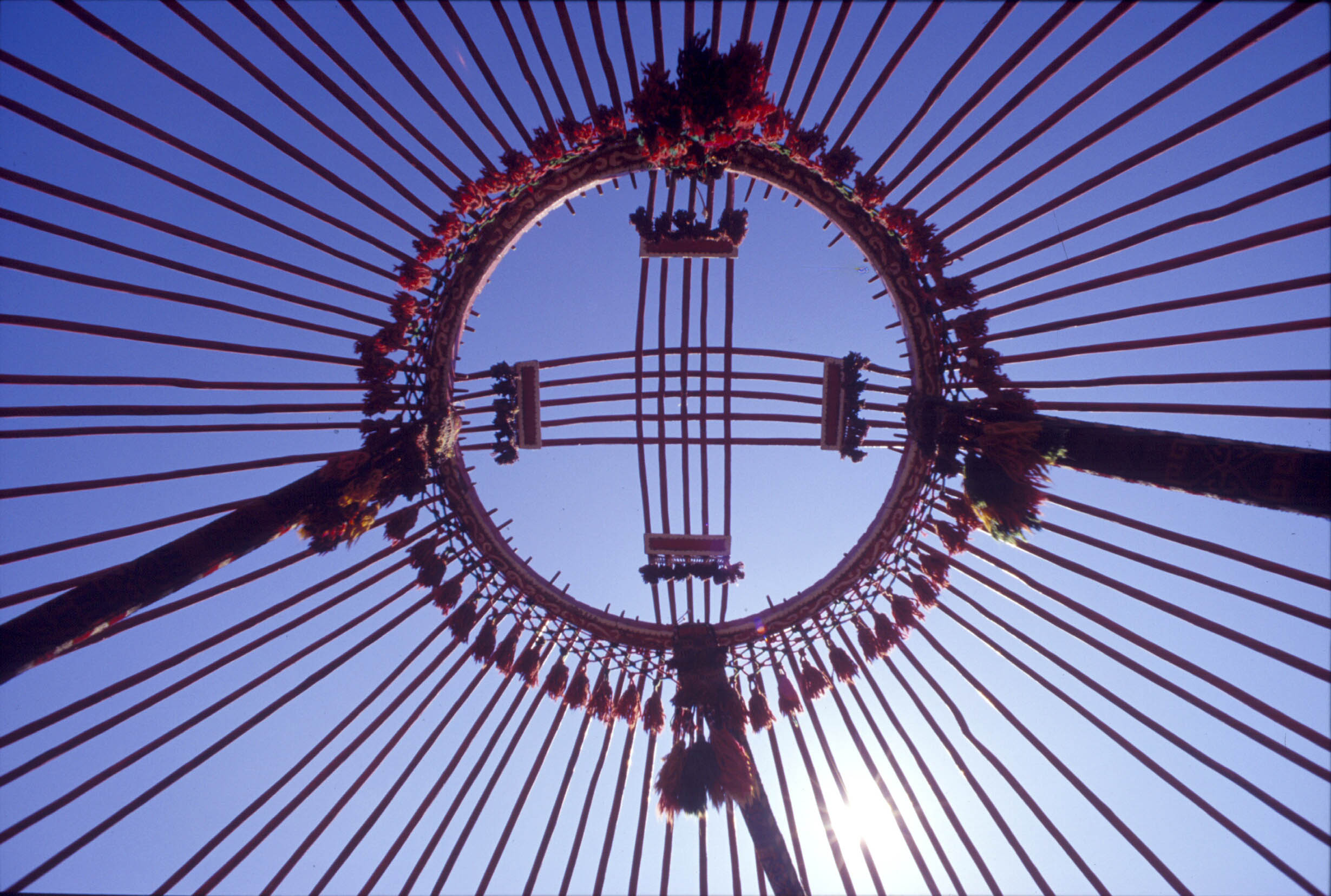 The opening at the top of a Kazakh yurt is called a Shangiraq. It functions by holding the yurt together, but also symbolizes the hearth of the home and the wheel of the sun.