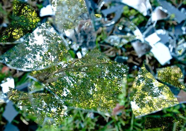These three images that did that for me.   The broken mirror reflecting the surrounding woods was alongside the road.  The women in Singapore were having fun with a freestanding set of translucent and mirrored panels and the sculpture near Madison Square park in New York created segmented and reflected views of the iconic Flatiron building, the Empire State building and a tour bus along Fifth Avenue.