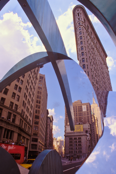 Reflection of the Flatiron Building from mirror sculpture at 23rd St. and Fifth Avenue, New York City