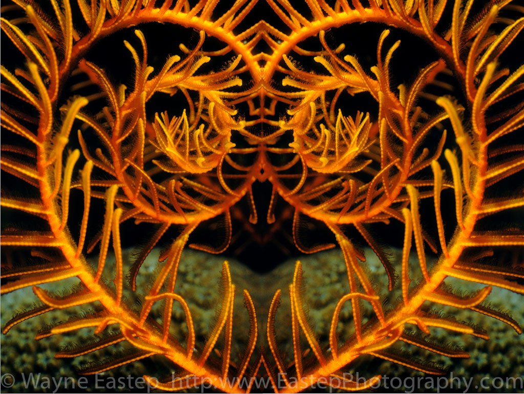 A few years ago a project came along which gave me the opportunity to work with one of the finest designers  in America, Chip Reay.  Chip selected from my underwater images  ones which had  clean simple design .  He played with the photographs by making a duplicate of the image, flipping it and merging it with the original. the result was a wonderful mirror image, a delightful rorschach.  These three images are examples of his successful collaboration with my photographs.